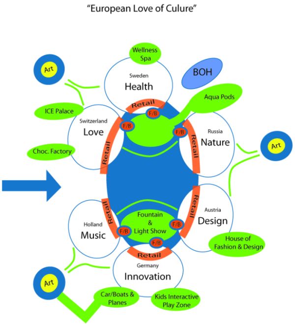 The World is a man-made archipelago of 300 islands off the coast of Dubai inspired by the shape of a world map. Central to the World lies the Heart of Europe, a mixed-use development on several European islands. EDG developed a strategy to reposition the multi-hotel resort into a tourist entertainment destination by defining an entertainment and retail overlay with multiple attractions, shows, and animal experiences in 6 entertainment zones related to the various themes and cultures of the countries of Europe represented. EDG was responsible for the overall analysis, vision plan, content development, and programming.